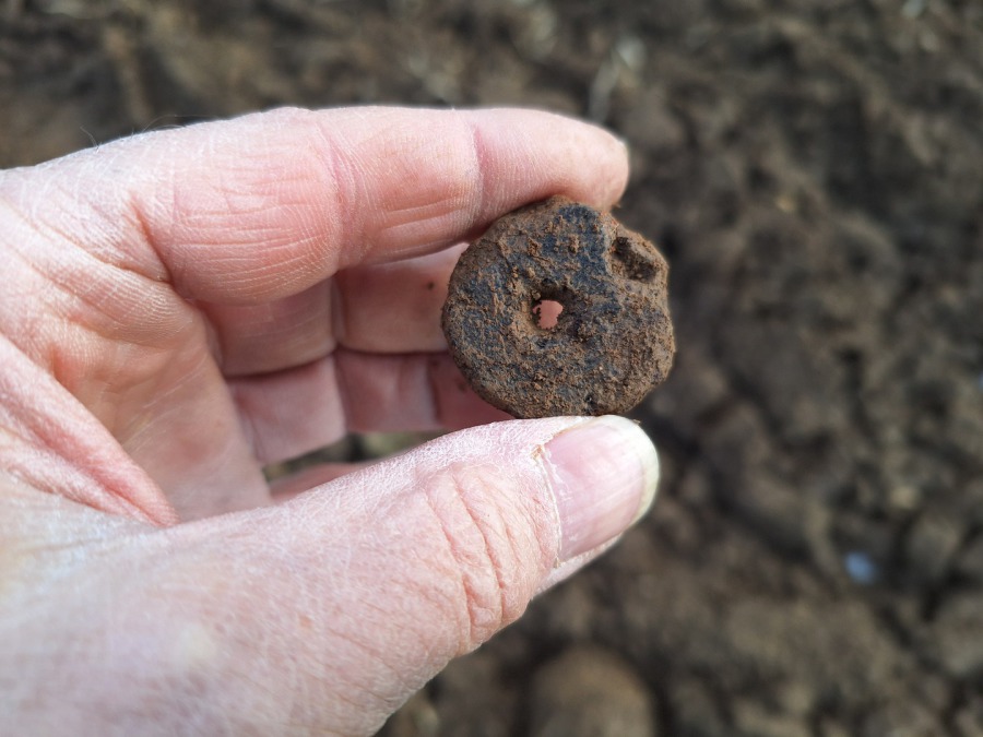 Am Ende März 2026 eigentlich nur eine Scherbe gefunden , die es aber in sich hat. Nämlich ein Loch, die es als Scherbenwirtel ausweist. Also frühes Recycling von Scherben als Spinnwirtel